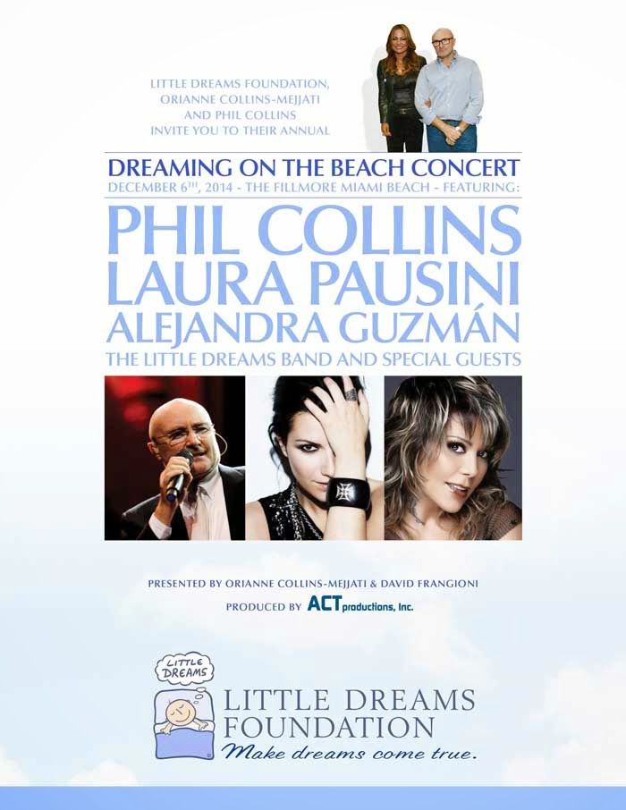 Em Maio, já tinha cantado 2 faixas na Escola Miami Country Day, "In the Air Tonight" e "Land of Confusion", onde o seu filho participou como parte da beneficiência. Desta vez, Collins vai interpretar mais que 2 músicas e vai estar muito bem acompanhado: a magnífica Laura Pausini e Alejandra Guzmán são outros nomes de peso que fazem parte do cartaz do Espectáculo "Dreaming on the Beach", que irá decorrer dia 06 de Dezembro, na praia de Miami, Fillmore. Este concerto tem o "carimbo" da Little Dreams Foundation, organização de caridade que Phil e a sua mulher Orianne criaram no ano 2000, para concretizar os sonhos dos jovens talentos. É o 1º concerto de Phil Collins em 4 anos, o último foi em 2010, na digressão do álbum de versões da Motown, "Going Back". Bem vindo de volta, Phil!