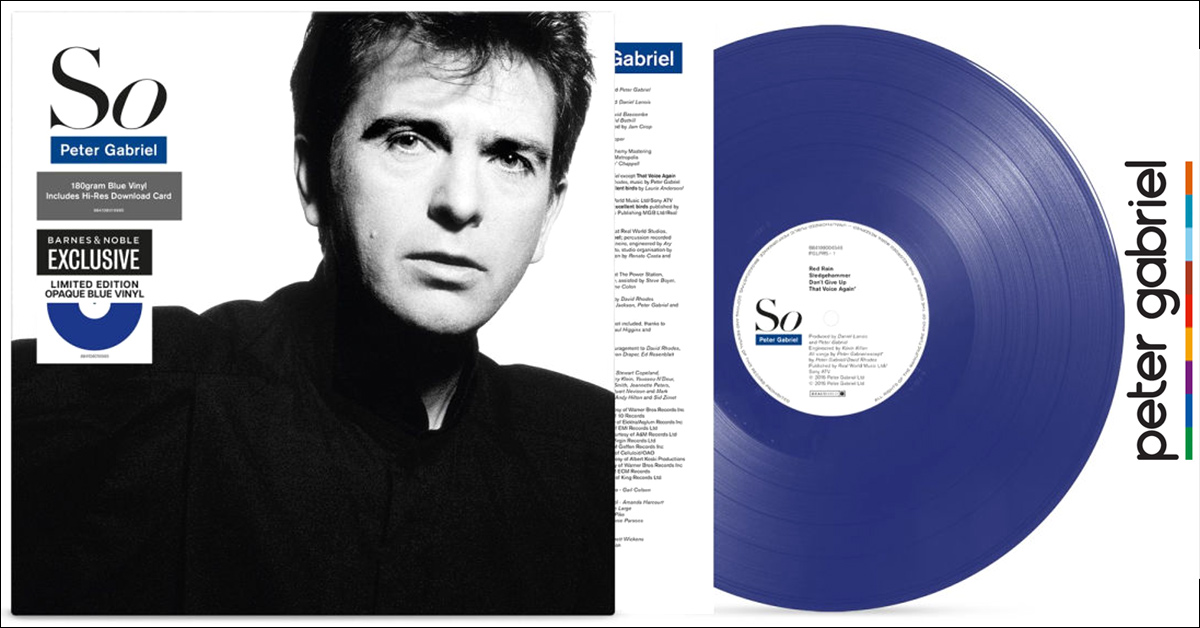 O 5º álbum de estúdio de Peter Gabriel, "So", originalmente lançado em 1986, vai ser relançado em Vynil azul opaco de 180 gramas no dia 04 de Outubro, provavelmente apenas nos E.U.A. A "tarefa" está a cargo da retalhista Barnes & Noble. Não há previsão ou planos de ser lançado na Europa, sendo que a sua importação poderá ser dificil e dispendiosa. O preço é de €29,99.